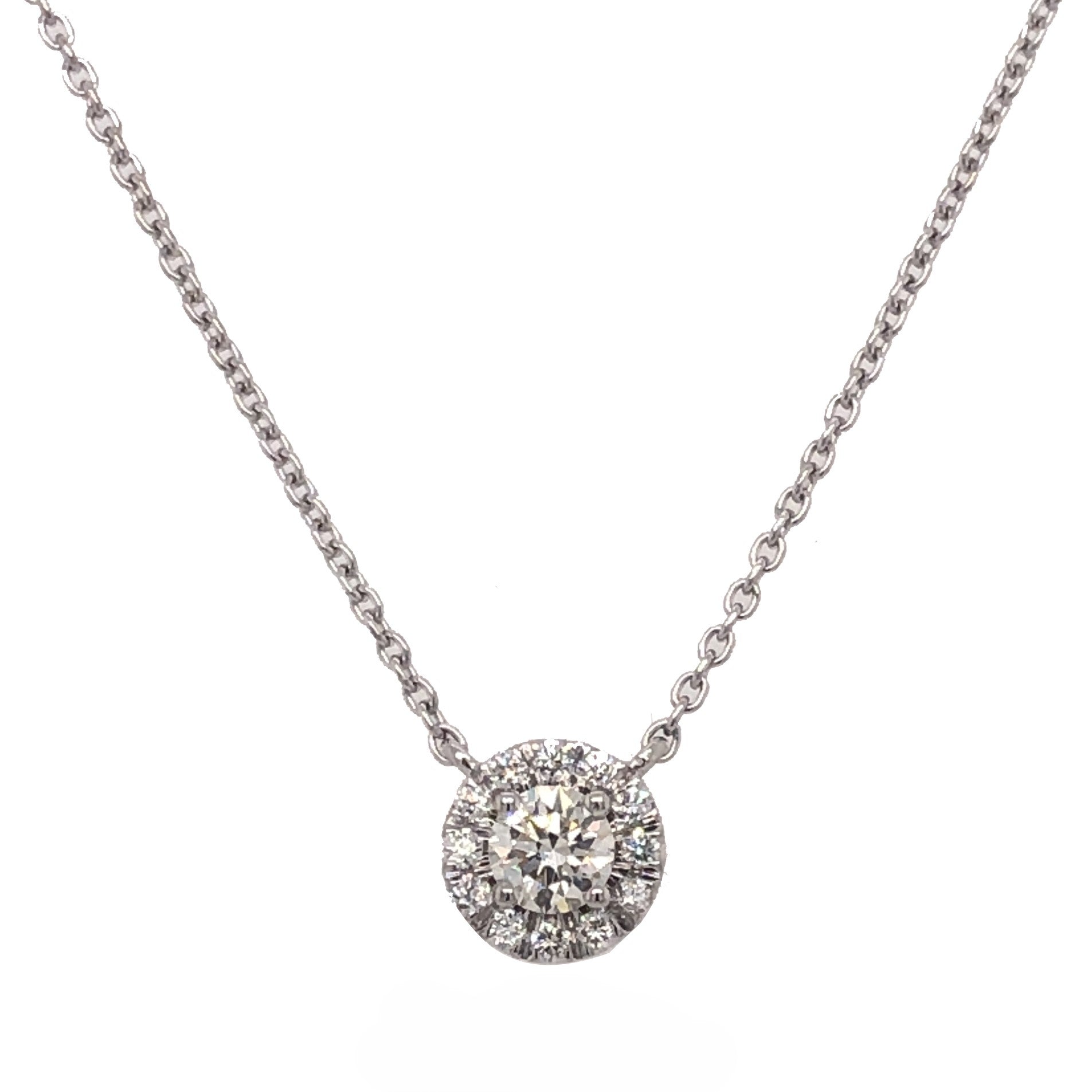 14K white gold halo pendant set with (1) round diamond weighing .29ct, Color: F-G; Clarity: VS, surrounded by (12) round diamonds totaling .12cts, The cable link chain is 16 to 18 inches with a lobster clasp.