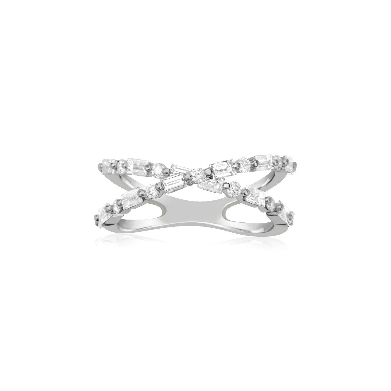 14K white gold partial "X" band set with (12) baguette diamonds totaling .60cts and (14) round diamonds totaling .22cts, Color: G; Clarity: VS2-SI, Finger size 6.