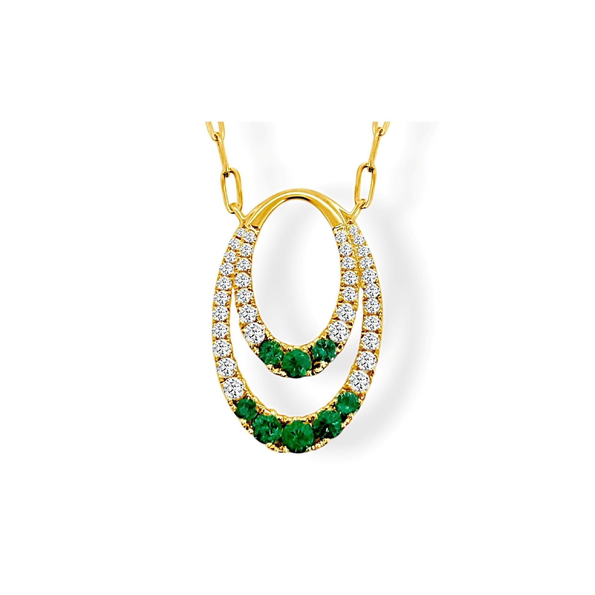 14K yellow gold double circle pendant set with pendant set with (8) round emeralds totaling .25cts and (36) round stones totaling .29cts. The pendant is on a paperclip chain in 18 inches with a lobster clasp