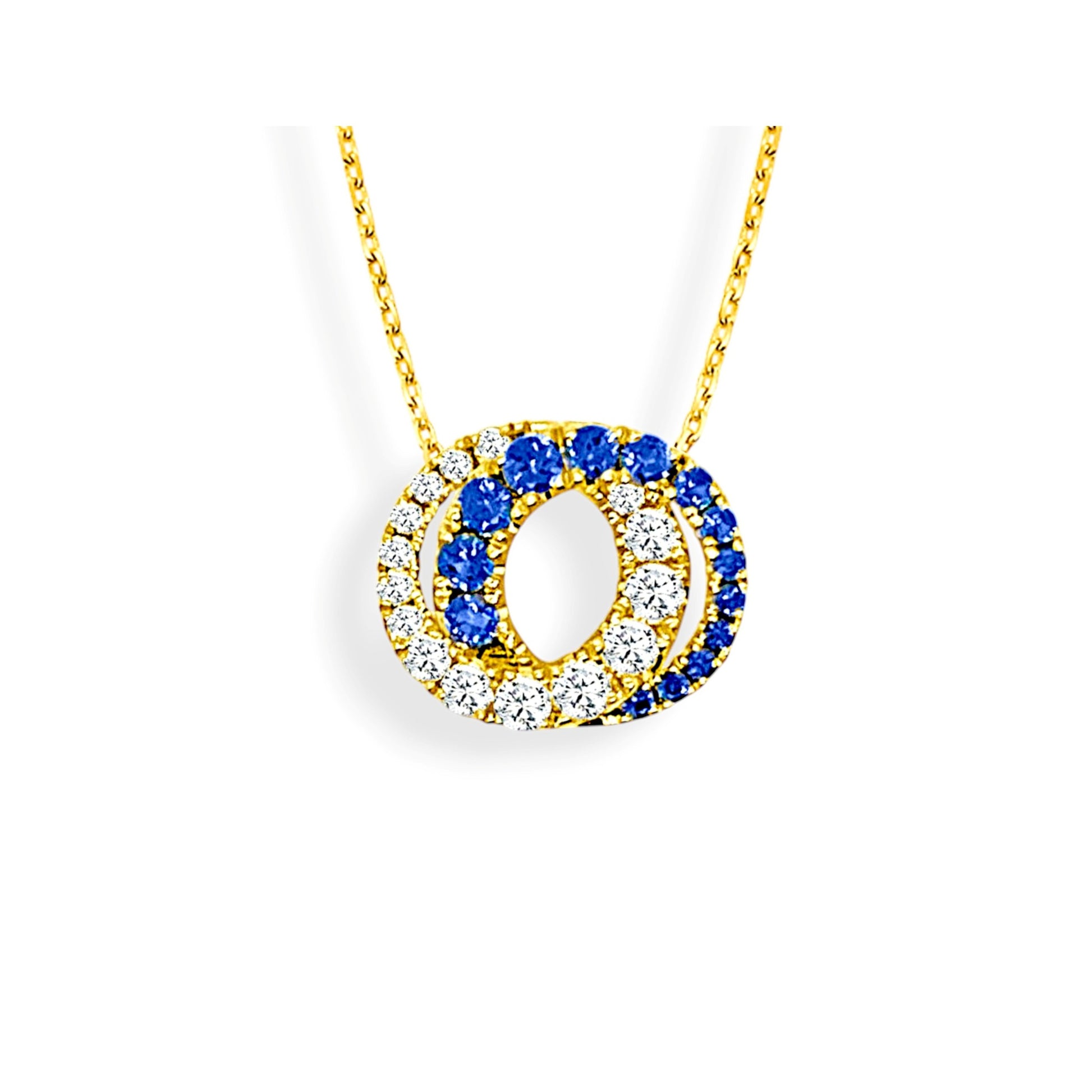 14K yellow gold double interlocking circle pendant. One circle is set with (15) round sapphires totaling .28cts and the other is set with (15) round diamonds totaling .26cts. The pendant is on link chain 16 inches with a lobster clasp.