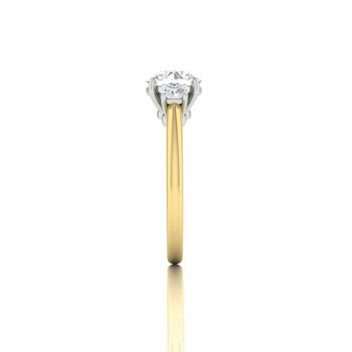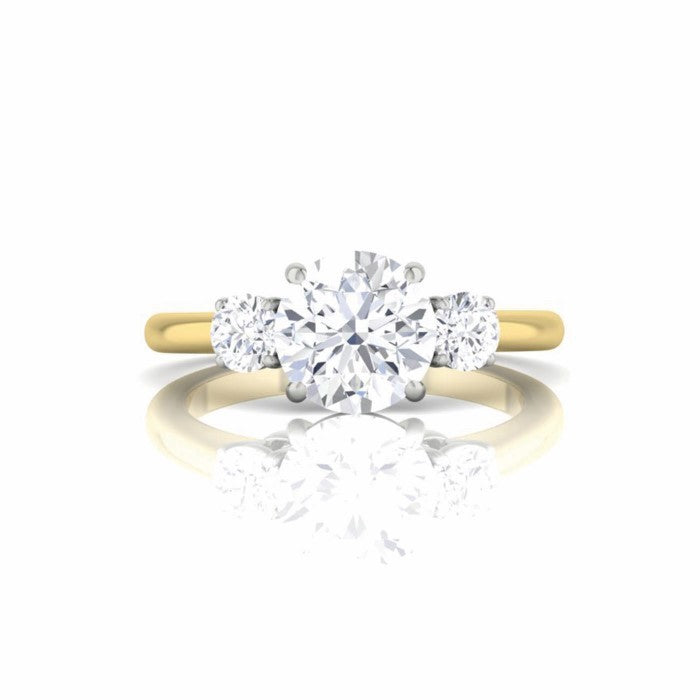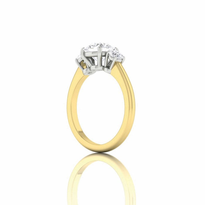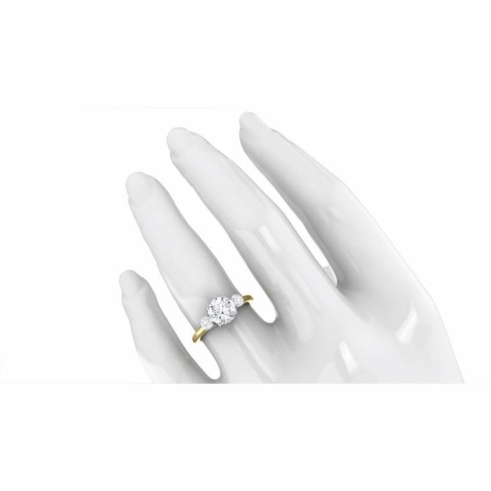 14K yellow gold engagement ring set with (1) round diamond in 14K white gold prongs weighing 1.50cts, Color; I; Clarity; VS1. accented with (2) round diamonds totaling .37cts, Finger size 6.5..