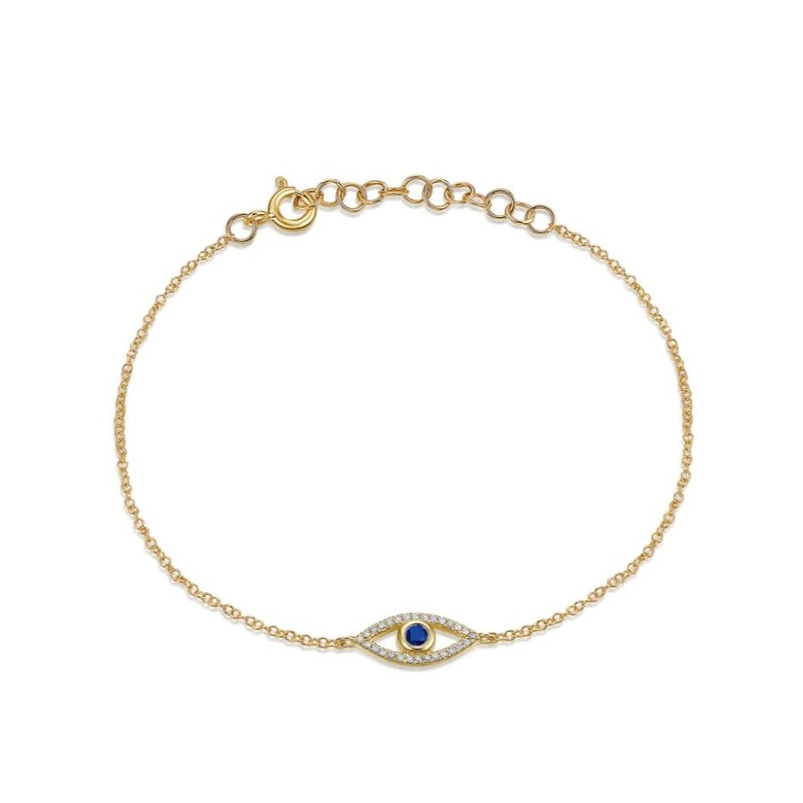 14K yellow gold evil eye bracelet set with (1) round blue sapphire weighing .07cts and surrounded by (28) round diamonds totaling .06cts. The bracelet is on a cable chain in 6 to 7 inches with a spring lock clasp
