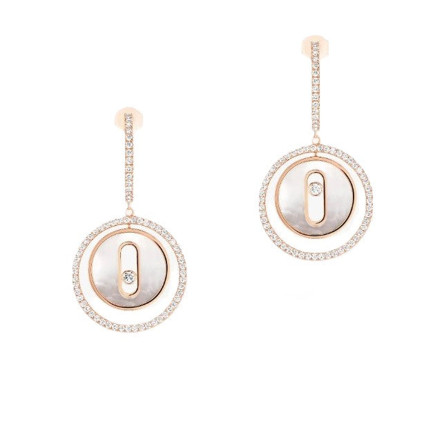 18K rose gold Lucky Move drop earrings, set with (2) round mother of pearls totaling 3.4cts and (136) round diamonds totaling .35cts. Color: G; Clarity: VS1. The earrings have post backs.