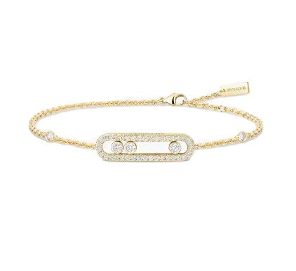 18K yellow gold Baby Move pavé bar bracelet with (45) round white diamonds totaling .28cts. Color: G; Clarity: VS. The bracelet is on a cable chain in 7.25 inches with a lobster clasp.