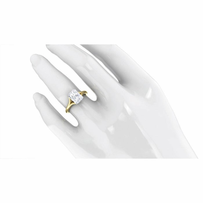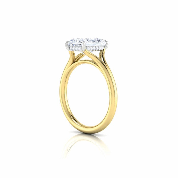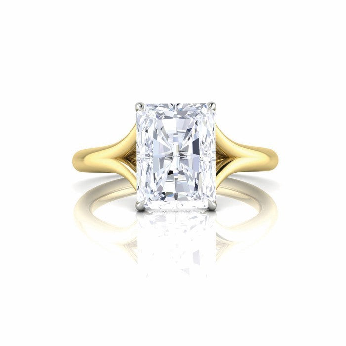 18K yellow gold with platinum engagement ring set with (1) radiant cut, natural diamond weighing 2cts. The diamond is set in a split shank mounting with a hidden halo set with (20) round diamonds totaling .05cts. Finger size 6.5. (This is a digital render. The color shown does not represent the actual color of the diamonds.)