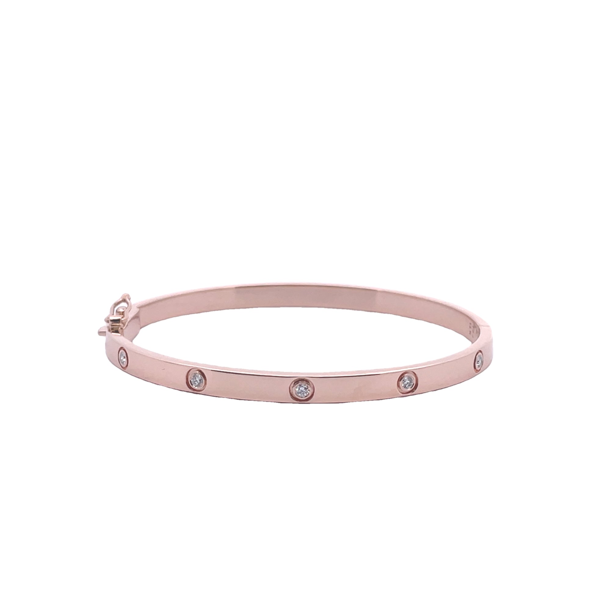 14K rose gold hinged double bezel bangle set with (5) round diamonds totaling .15cts.