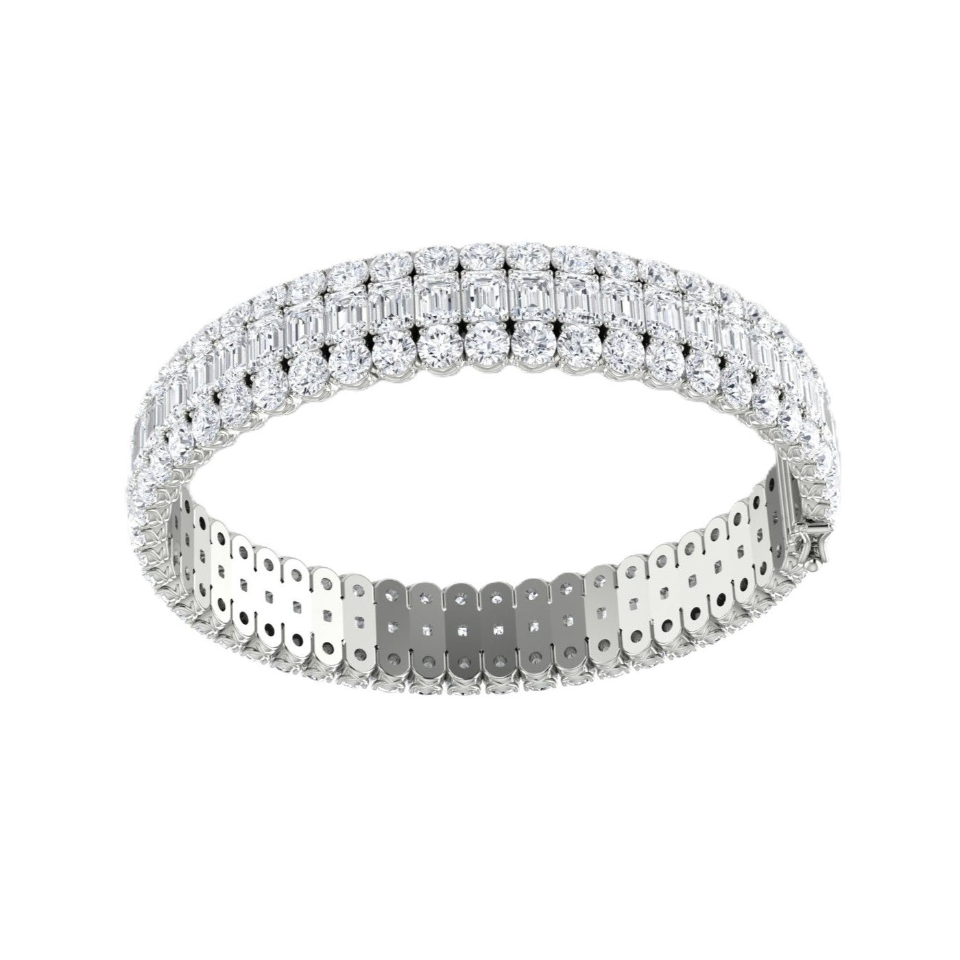 *18K white gold bracelet set with (50) natural emerald cut diamonds totaling 15.02cts and (100) natural round brilliant cut diamonds totaling 12.98cts. All emerald cuts are GIA certified as Color: D-F; Clarity: VVS1/VS1. The bracelet is 7 inches