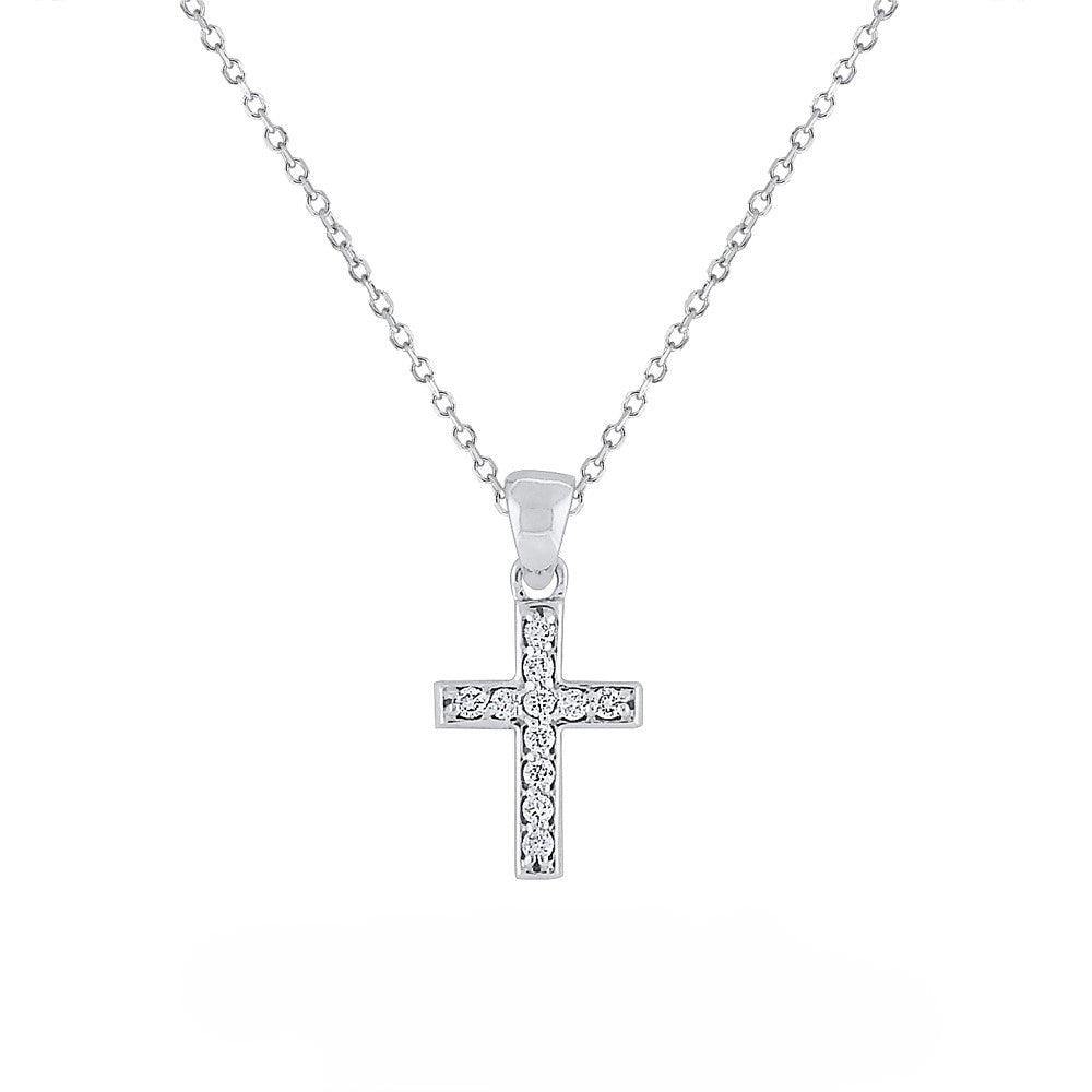 14K white gold cross pendant set with (11) round diamonds totaling .11cts. The pendant is on a cable chain in16 inches with a lobster clasp