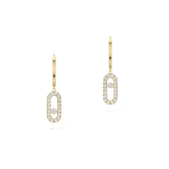18K yellow gold Move Uno drop earrings with hoop top. The drops are set with (38) round white diamonds totaling .19cts. Color: G; Clarity: VS. The earrings have post backs.