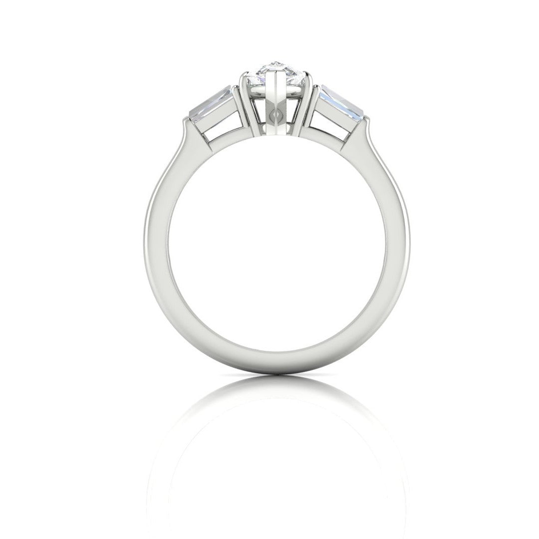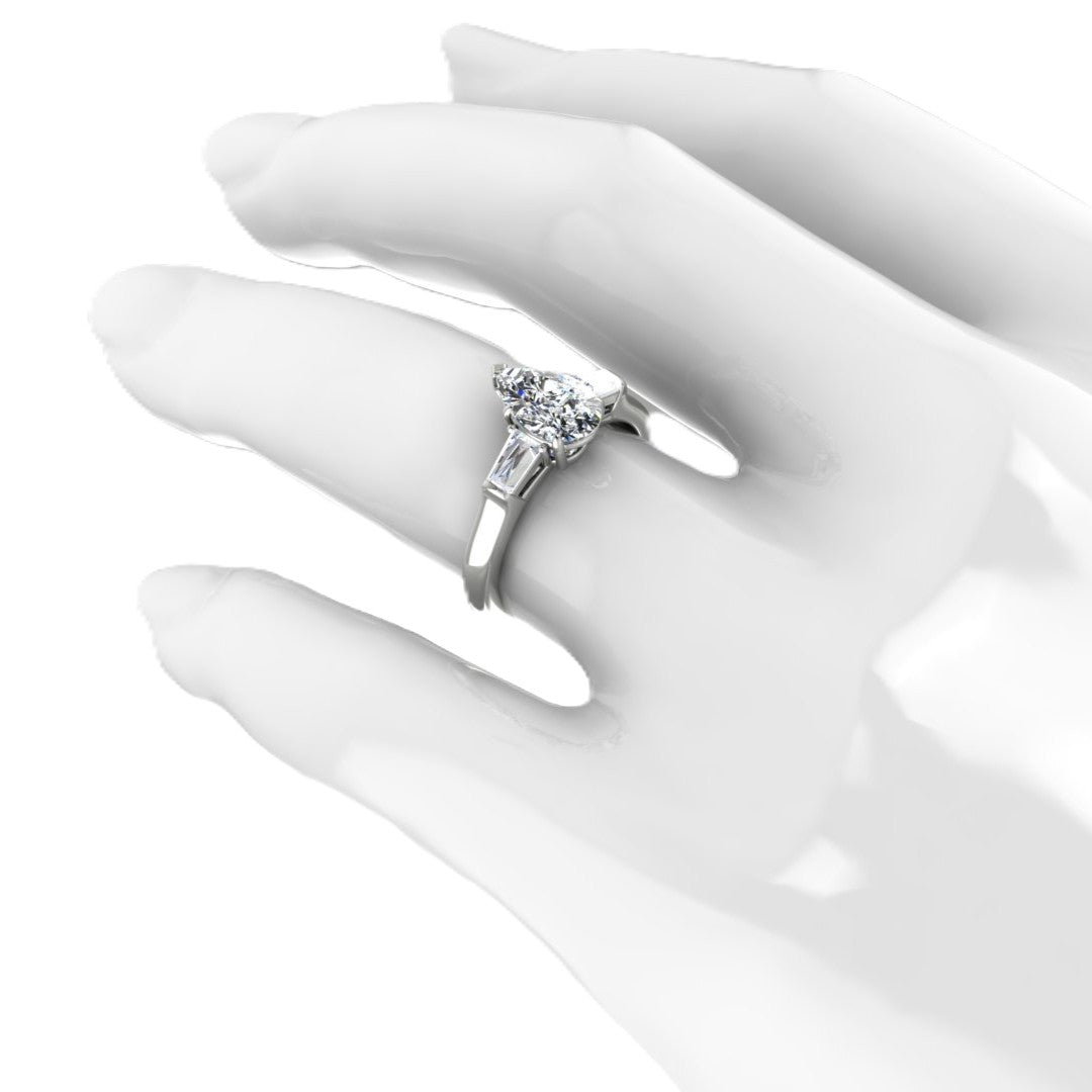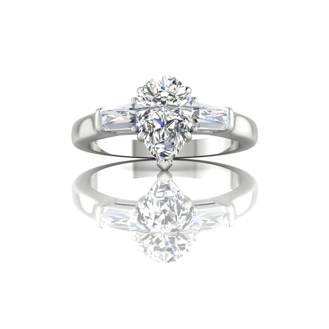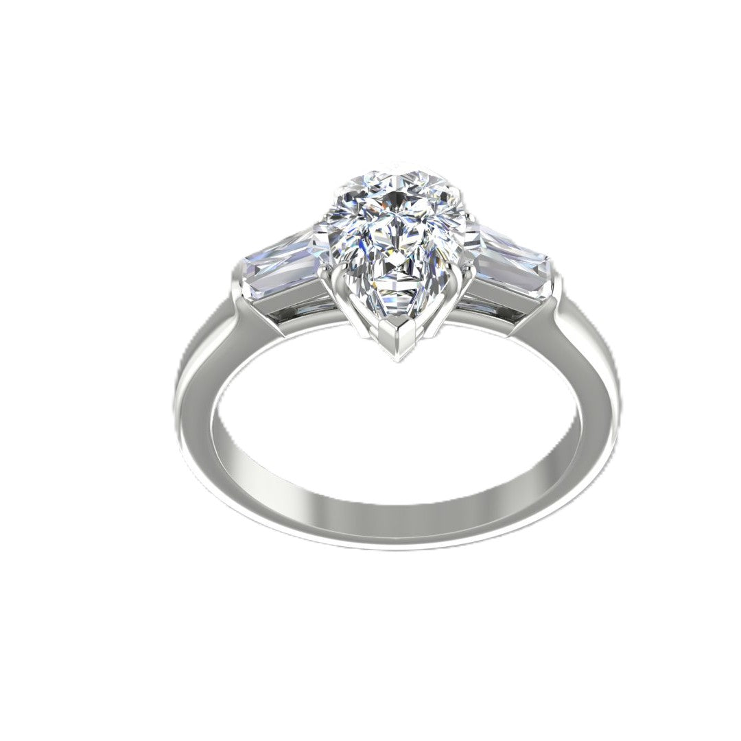 *14K white gold engagement ring set with (1) pear shaped diamond weighing 1.20cts, Color: E; Clarity: SI1. The ring is accented with (2) baguette diamonds totaling .35cts in a finger size 6.5.
