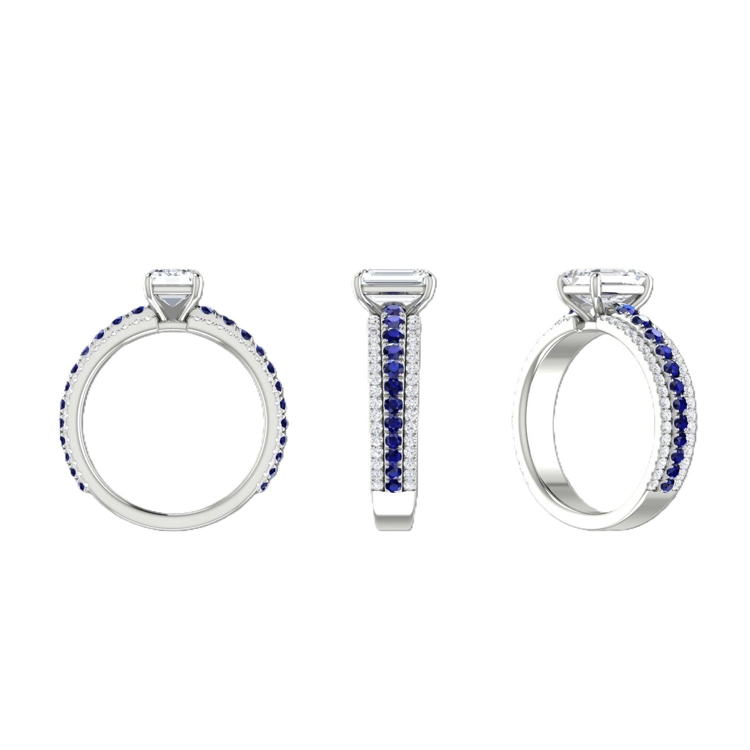 Platinum engagement ring set with (1) emerald cut diamond weighing 1.22cts, Color: E; Clarity: VVS2. The mounting has (24) round blue sapphires totaling .50cts and (72) round diamonds totaling .36cts. Finger size 8.