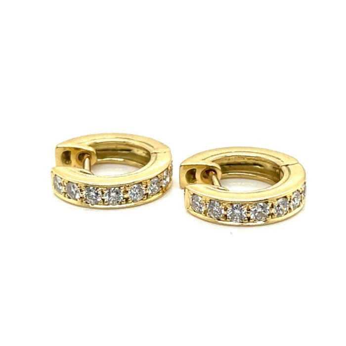 18K yellow gold huggie earrings, measuring 3 mm x 12.5 mm, set with (16) round diamonds totaling .40cts. The earrings have clutch closure.