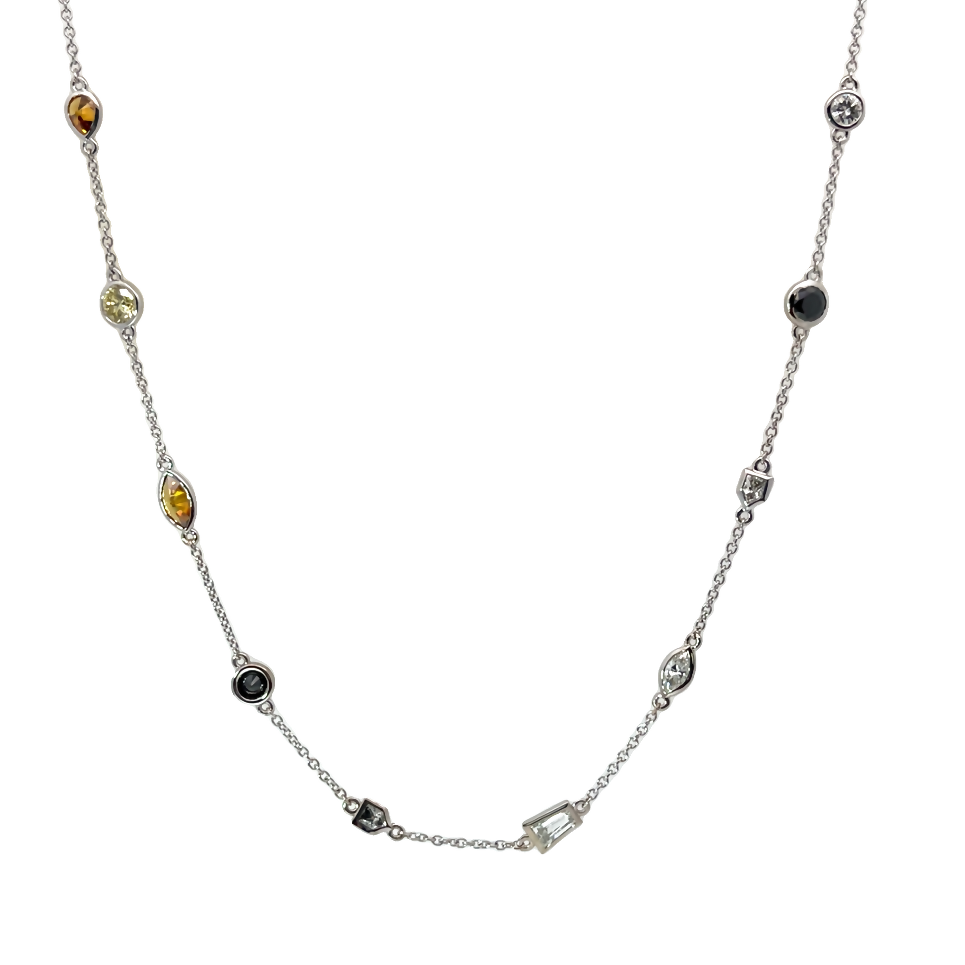 14K white gold bezel diamond by the yard necklace set with (13) white and fancy colored diamonds totaling 2.05cts. The necklace is 14 to 16 inches with a lobster clasp.
