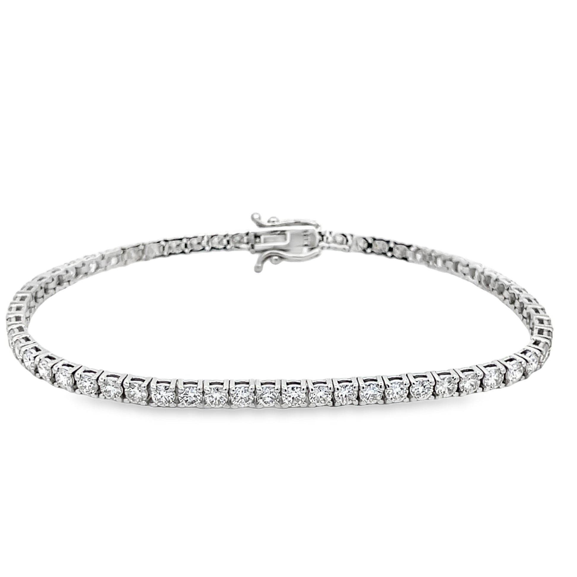 14K white gold tennis bracelet set with (73) round diamonds totaling 3.0cts. Color: F-G; Clarity: SI2. The bracelet is 7 inches.