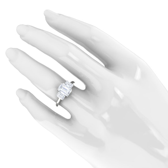 Platinum (3) stone engagement ring. Center stone is (1) emerald cut diamond weighing 1.90cts, Color: F; Clarity: VS1. (1) side emerald cut diamond weighing .46cts and (1) side emerald cut diamond weighing .48cts. Both Color: F; Clarity: VS1. Finger size is 6.5.