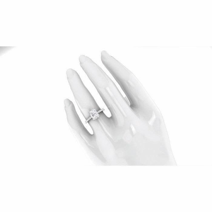 Platinum engagement ring set with (1) radiant cut, natural diamond weighing 1.52cts, Color: H; Clarity: SI1. The center stone is accented with (44) round diamonds totaling .33cts. Finger size 6.