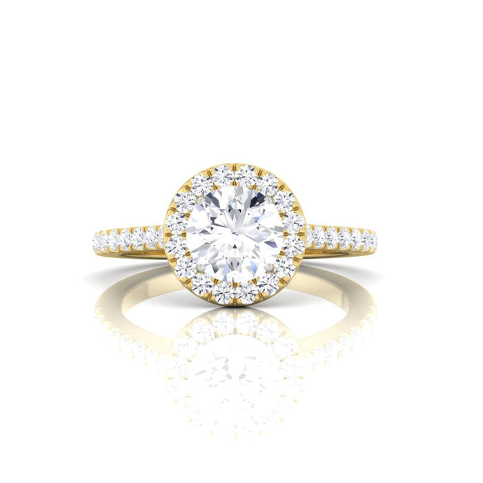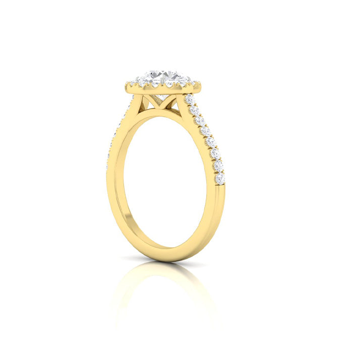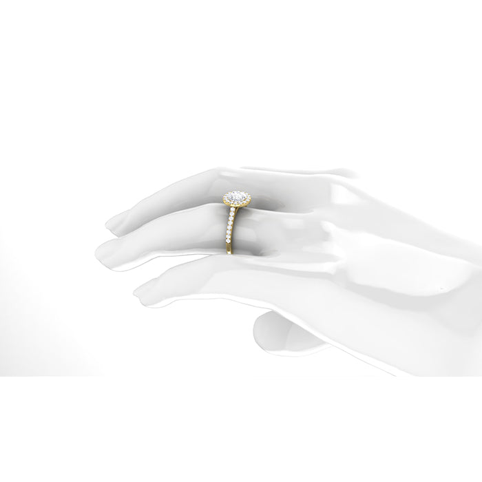 14K yellow gold halo engagement ring set with (1) round diamond weighing .90cts. Color: J; Clarity: VS2; surrounded by (32) round diamonds totaling .32cts. The finger size is 6.