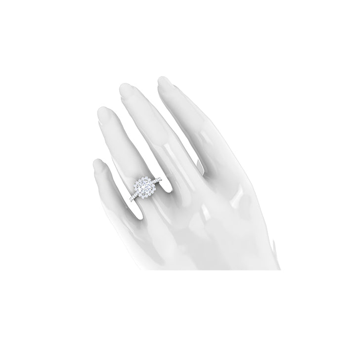 14K white gold halo engagement ring set with (1) round diamond weighing 1.01cts. Color: E; Clarity: VS2; surrounded by (30) round diamonds totaling .50cts. The finger size is 6.75.