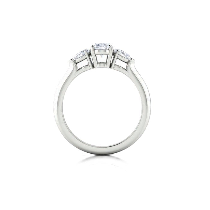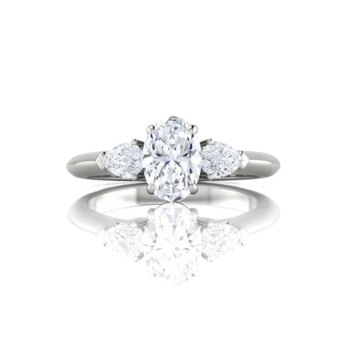 14K white gold engagement ring with (1) oval natural diamond weighing .70cts, Color: F; Clarity: SI1. The center diamond is accented with (2) pear shaped diamonds totaling .30cts. Finger size 6.5.