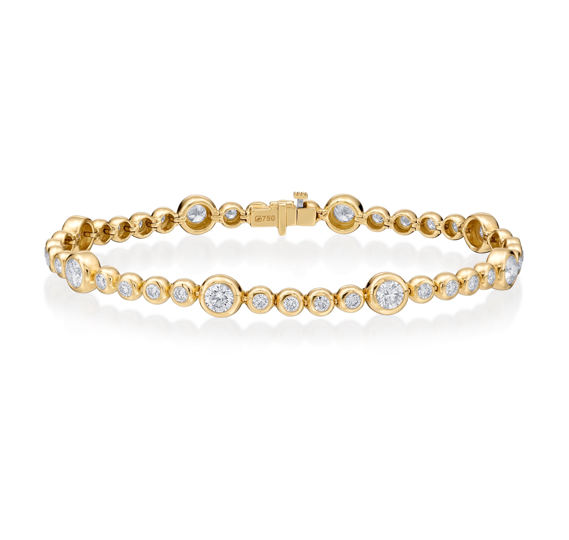 18K yellow gold Moonlight Collection bezel bracelet set with (40) round diamonds totaling 2.29cts, Color: G-H Clarity: VS2. The bracelet is 7.25 inches.