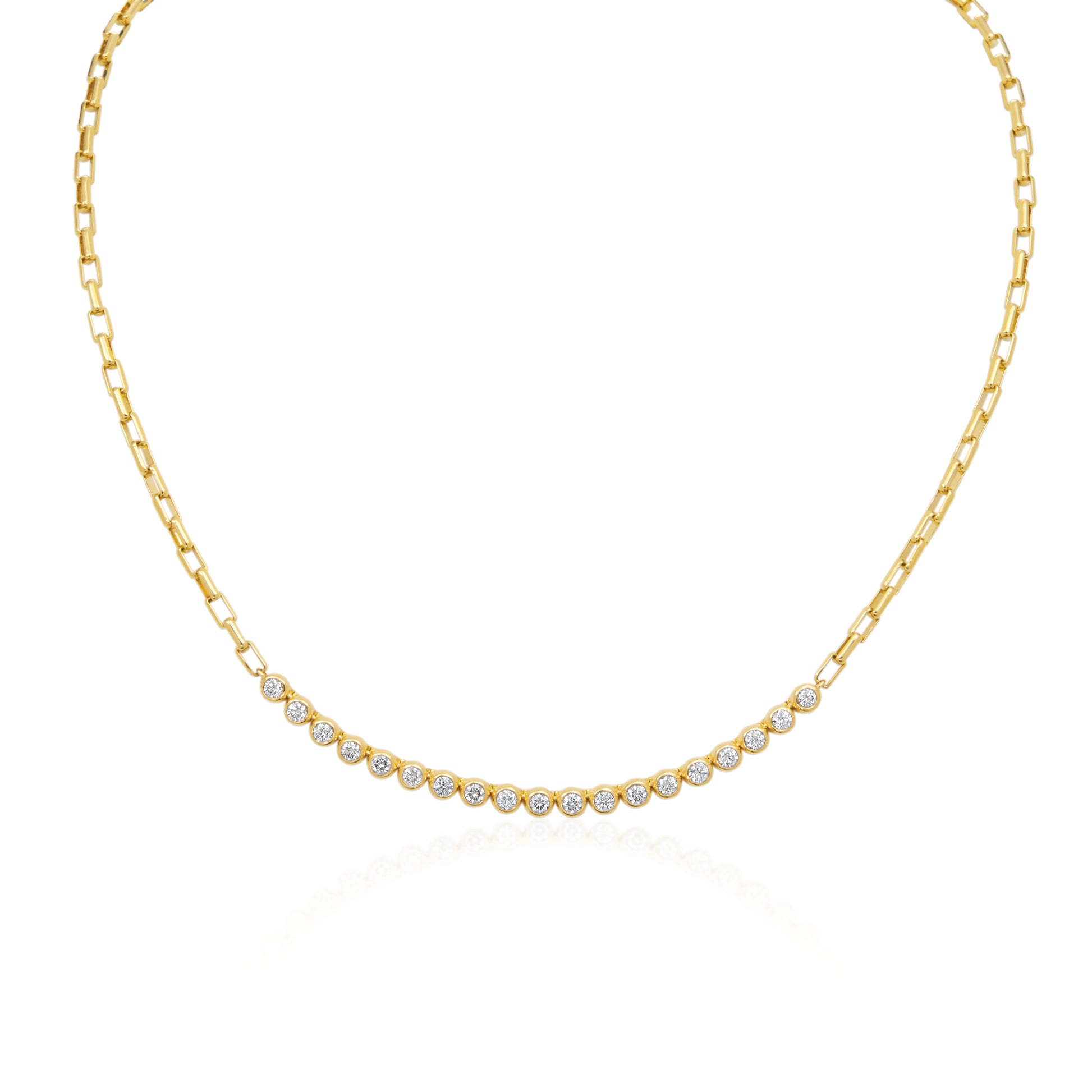 18K yellow gold Moonlight Collection bezel collar necklace set with (19) round diamonds totaling 1.08cts, Color: H-I; Clarity VS-SI1. The necklace is 16 inches.