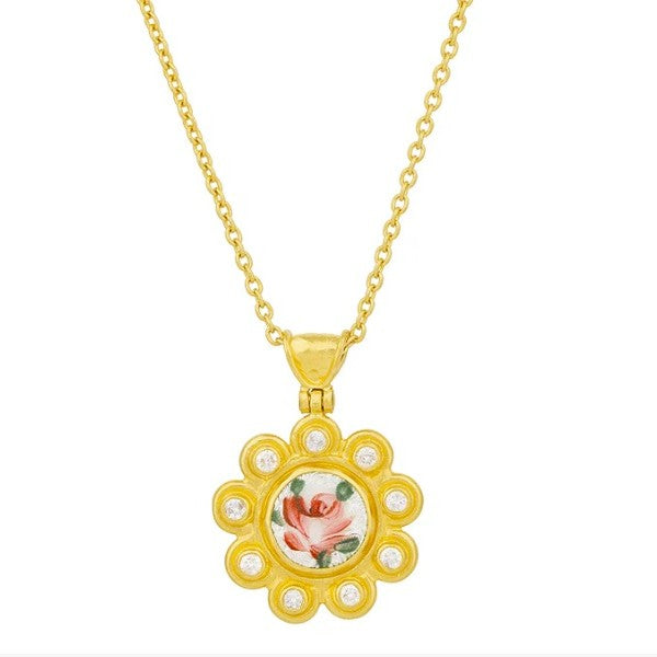 Antiquities Gold one of a kind pendant in 24K yellow gold featuring (1) round 9 mm cabochon Guilloche weighing 1.6cts, surrounded by (9) round white diamonds totaling .333cts. The pendant is on a 22K yellow gold solid link chain in 16 to18 inches with a 18K yellow gold lobster clasp.