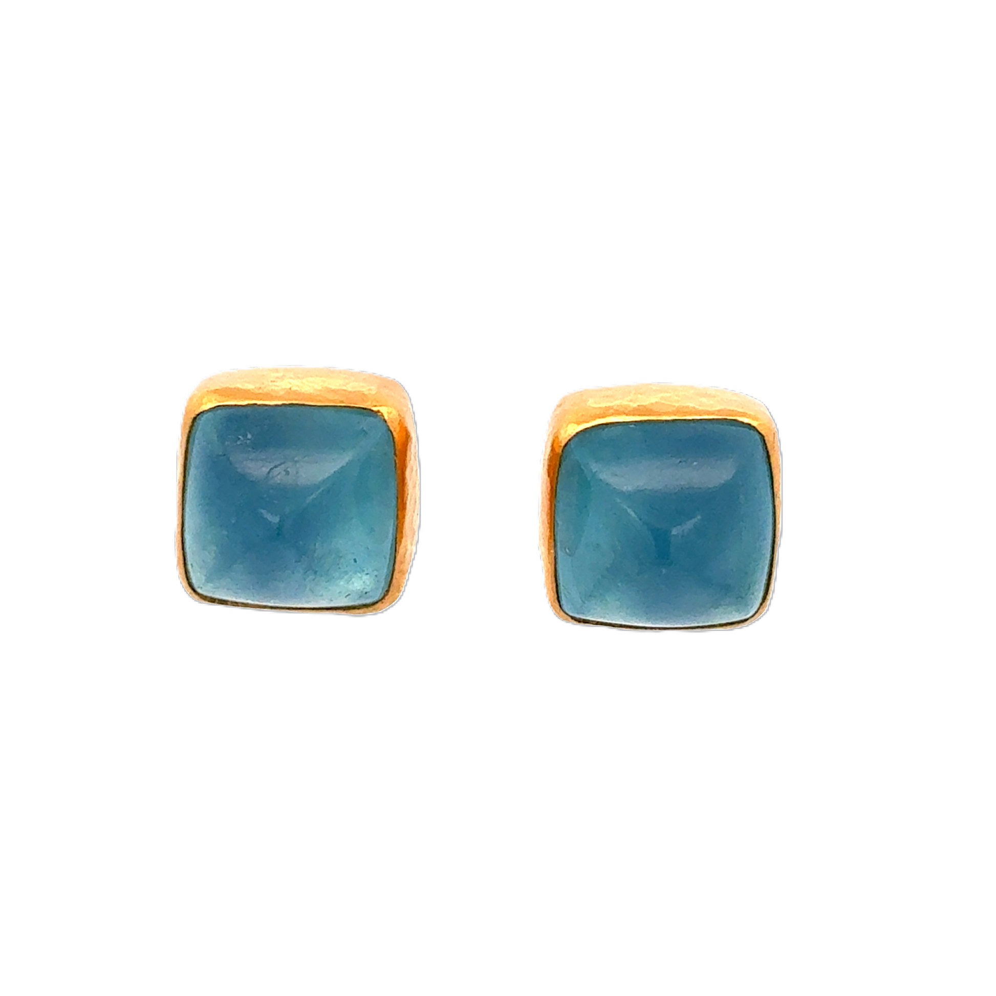 One of a kind stud earrings in 24K yellow gold featuring (2) 11 mm square sugarloaf aquamarines totaling 17.13cts. The earrings have 18K yellow gold post with vermeil large push backs.