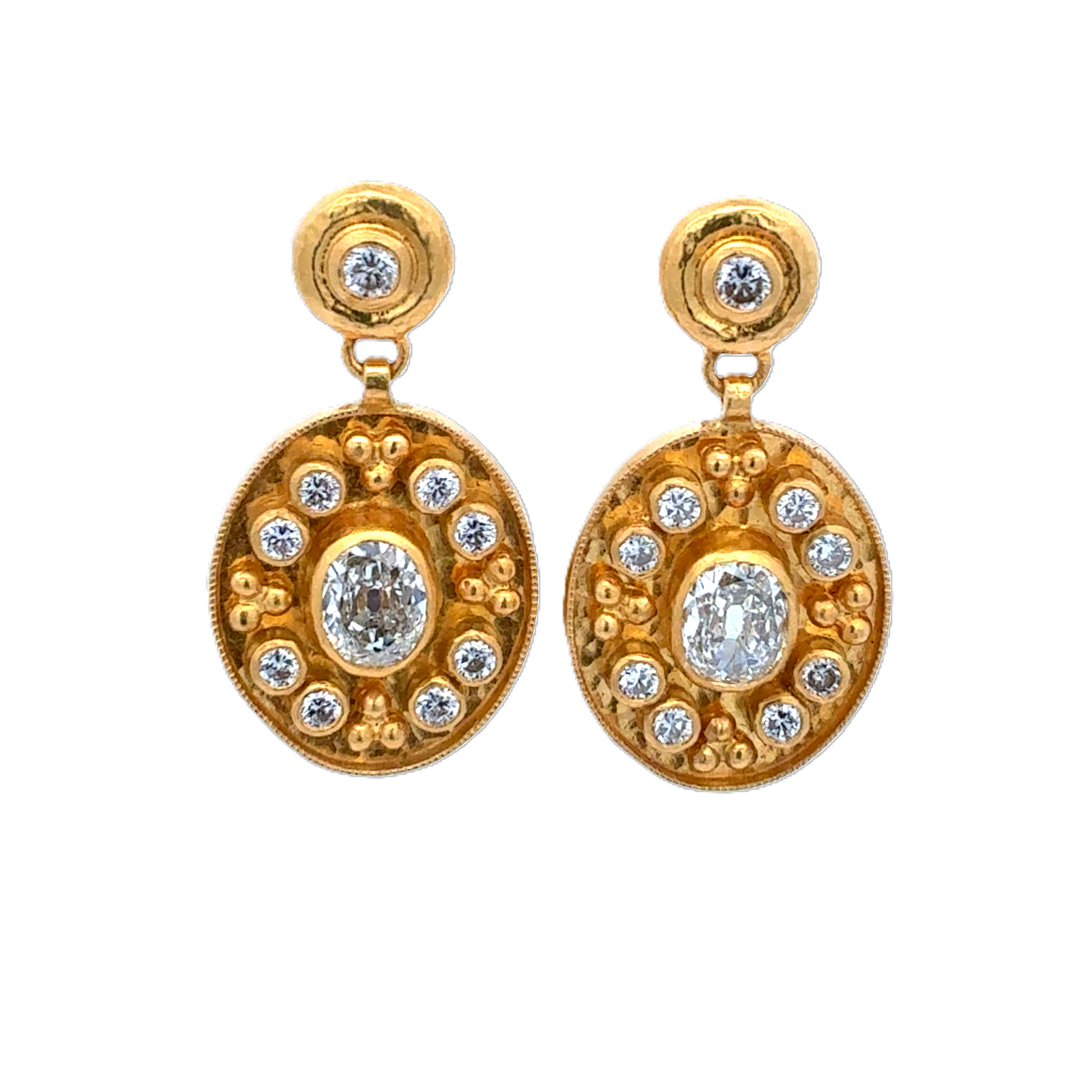 One of a kind single drop19x16 mm oval medallion earrings in 24/22K yellow gold featuring 7x5 mm oval cut white diamonds totaling 1.43cts, round brilliant cut white diamond clusters totaling .80cts. The earrings have 22K yellow gold droplet top with (2) round brilliant cut white diamonds totaling .22cts, 18K yellow gold post with vermeil large push backs.