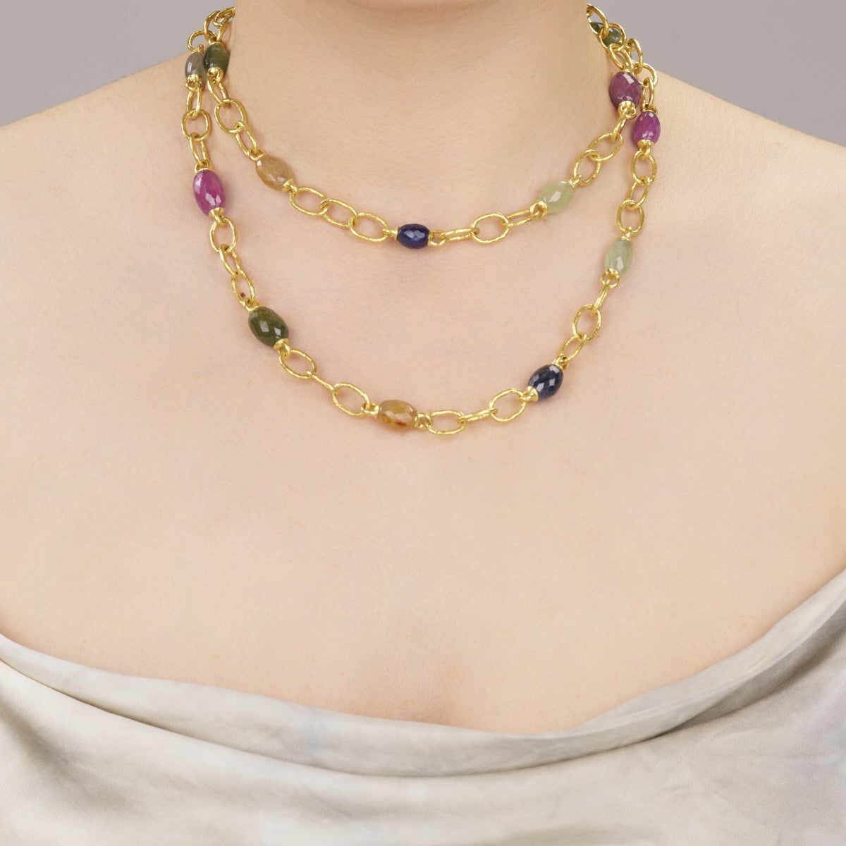 One of a kind necklace in 24K yellow god featuring (18) mixed sized oval faceted fancy multi colored sapphires totaling 187.62cts. The necklace has 24/22K gold caps and 24K yellow gold links in 35.5 inches with an 18K yellow gold lobster clasp with (1) round diamond weighing .032cts