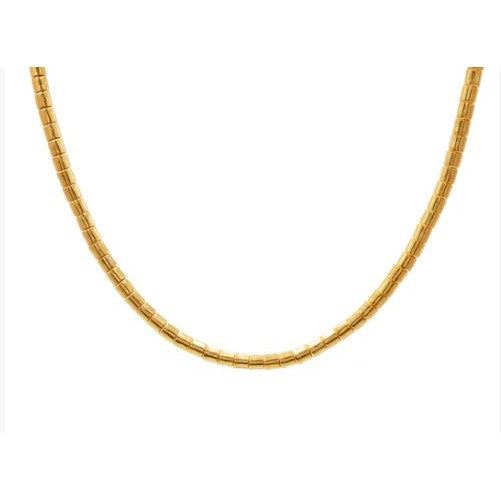 24K yellow gold single strand Vertigo necklace, set with (1) round diamond weighing .0142. Color: G-H. The necklace is 16 to 18 inches with a 22K extension chain and lobster clasp.