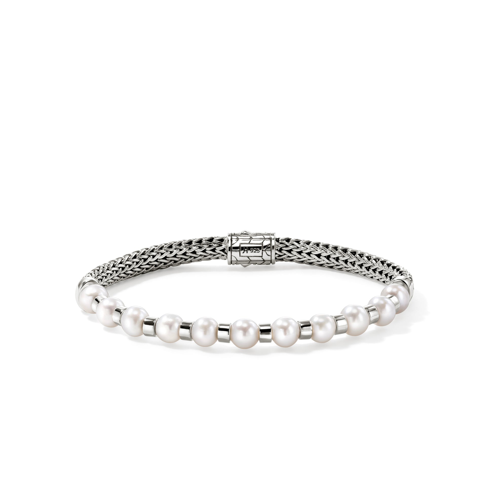 Sterling silver JH Essentials 5 mm chain bracelet with 5.5-6 mm and 6-6.5 mm cultured Freshwater pearls and pusher clasp. The bracelet is size medium.