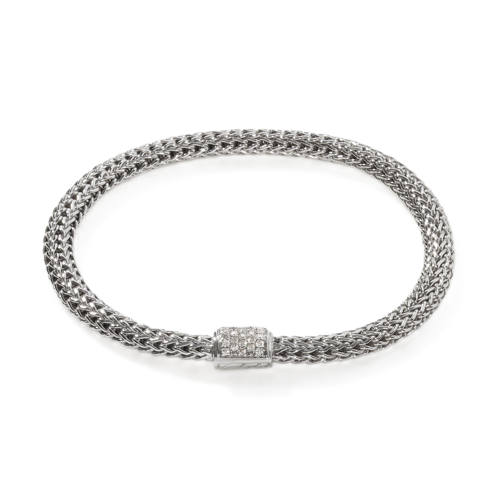Sterling silver Icon 5 mm bracelet with pave diamond pusher clasp totaling .18cts. The bracelet is size medium.