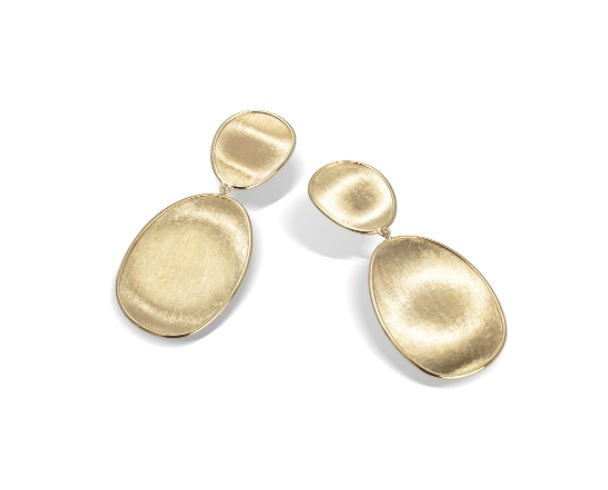 18K yellow gold Lunaria hand engraved double drop earrings with post backs.