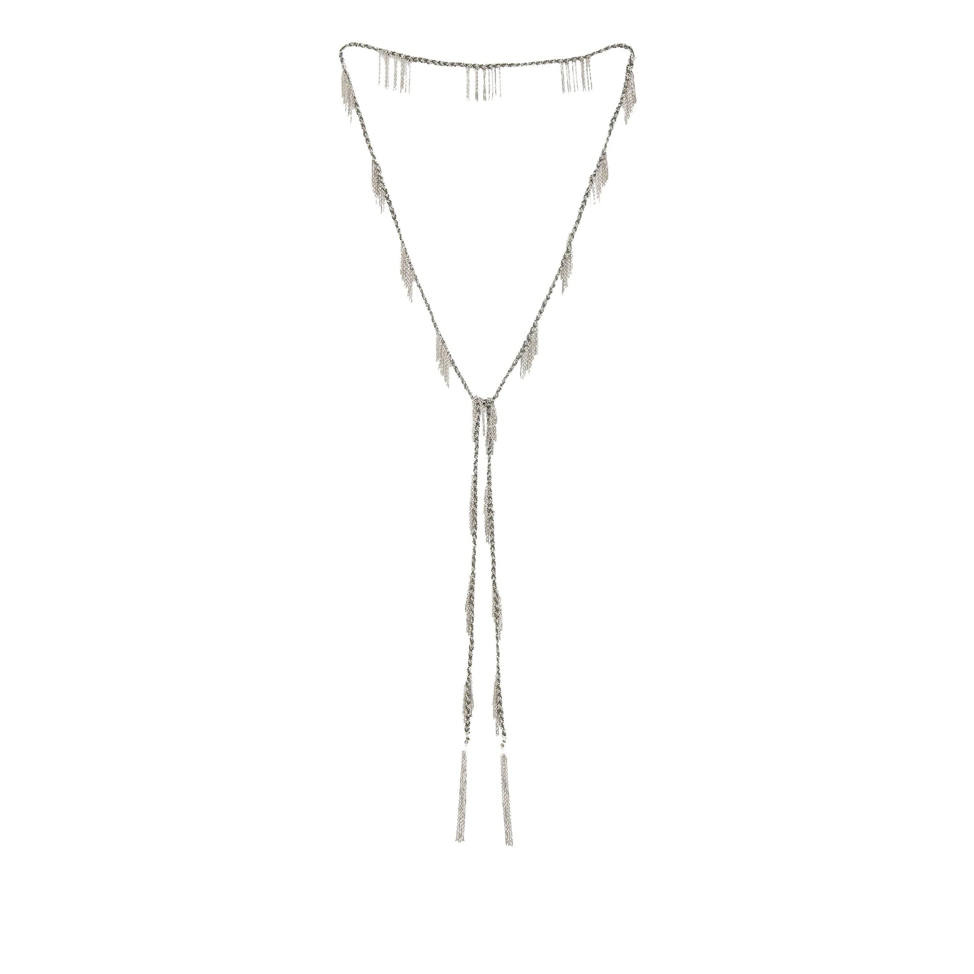 Sterling silver/grey thin braided lariat necklace with multi-strand chain fringe chain and gold lurex yarn to be tied or wrapped in 38 inches.