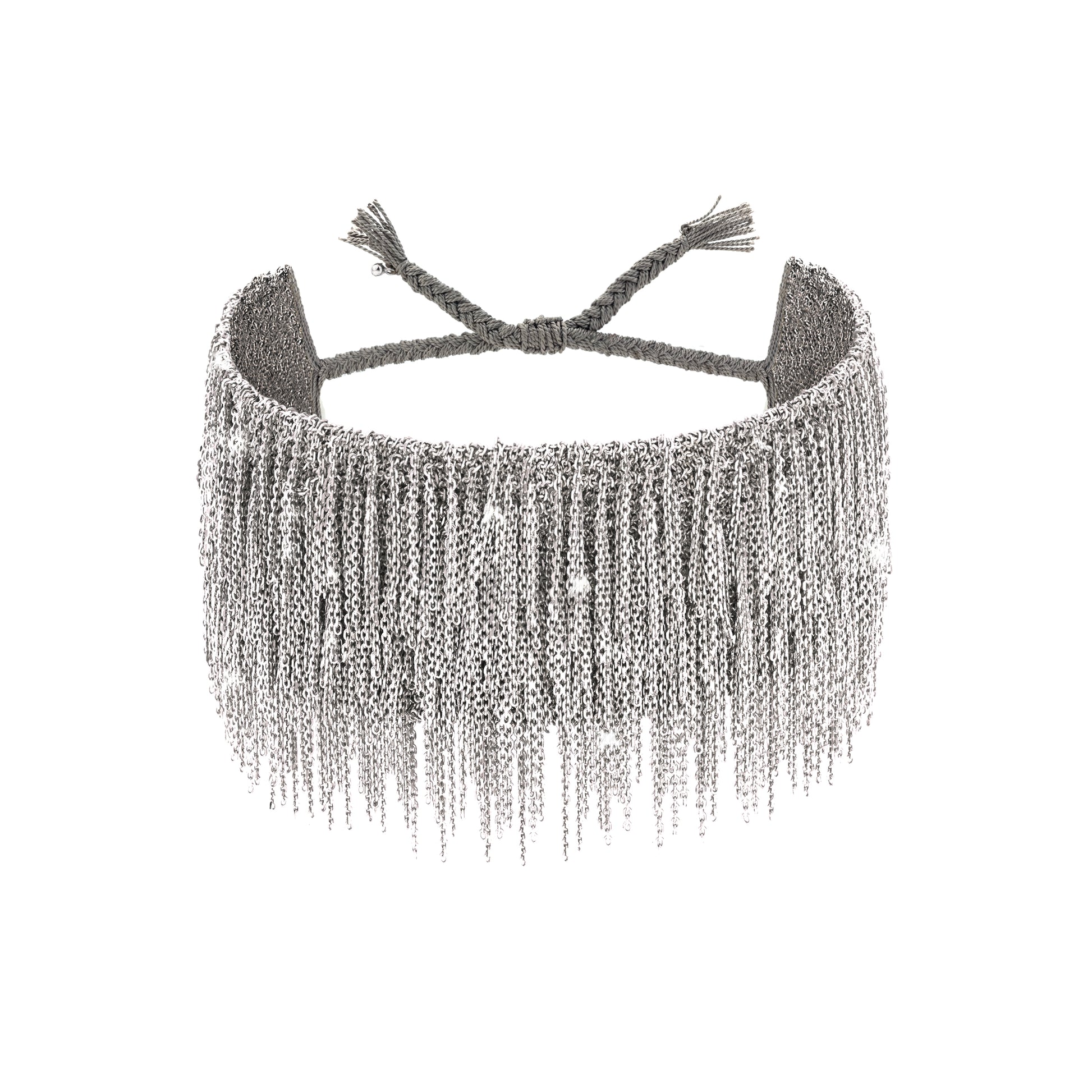 Sterling silver large woven cuff bracelet with multi-strand chain fringe made of chain and grey silk yarn. The bracelet has a sliding knot closer with grey silk thread on each end.