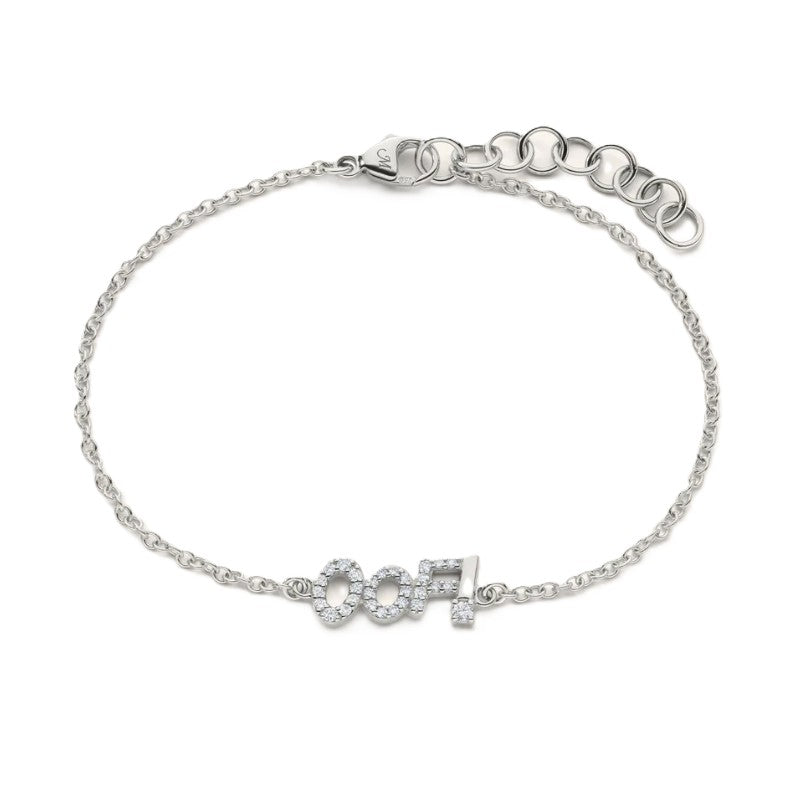 Sterling silver "OOF" bracelet set with round pave white sapphires totaling .17cts. The bracelet is on a cable chain in 6.75 inches with a lobster clasp.