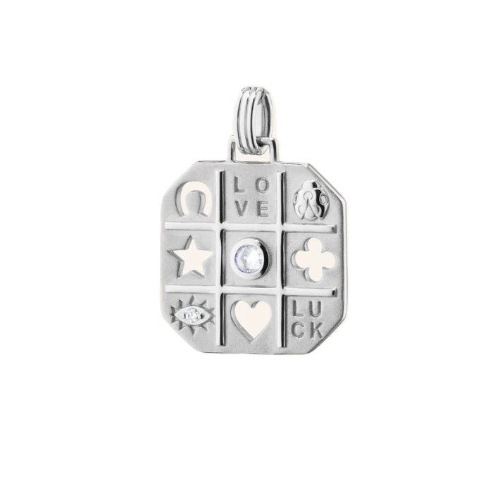 Sterling silver "Luck" Charm with cut out and engrave symbols with (1) rose cut center white sapphire.