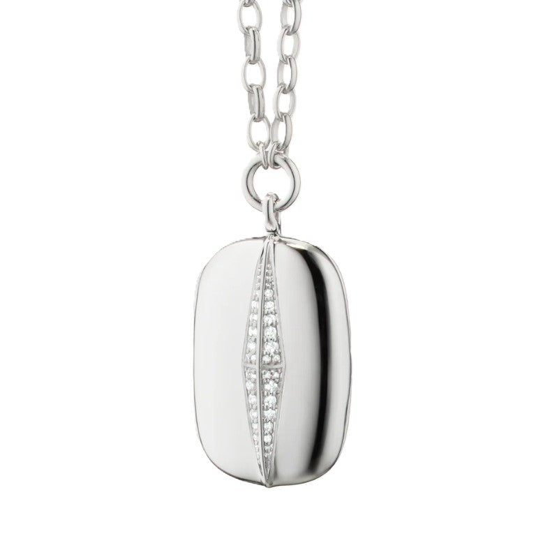 Sterling silver Points North locket pendant set with white sapphires totaling .17cts. The pendant is on a cable chain in 18 to 20 inches.