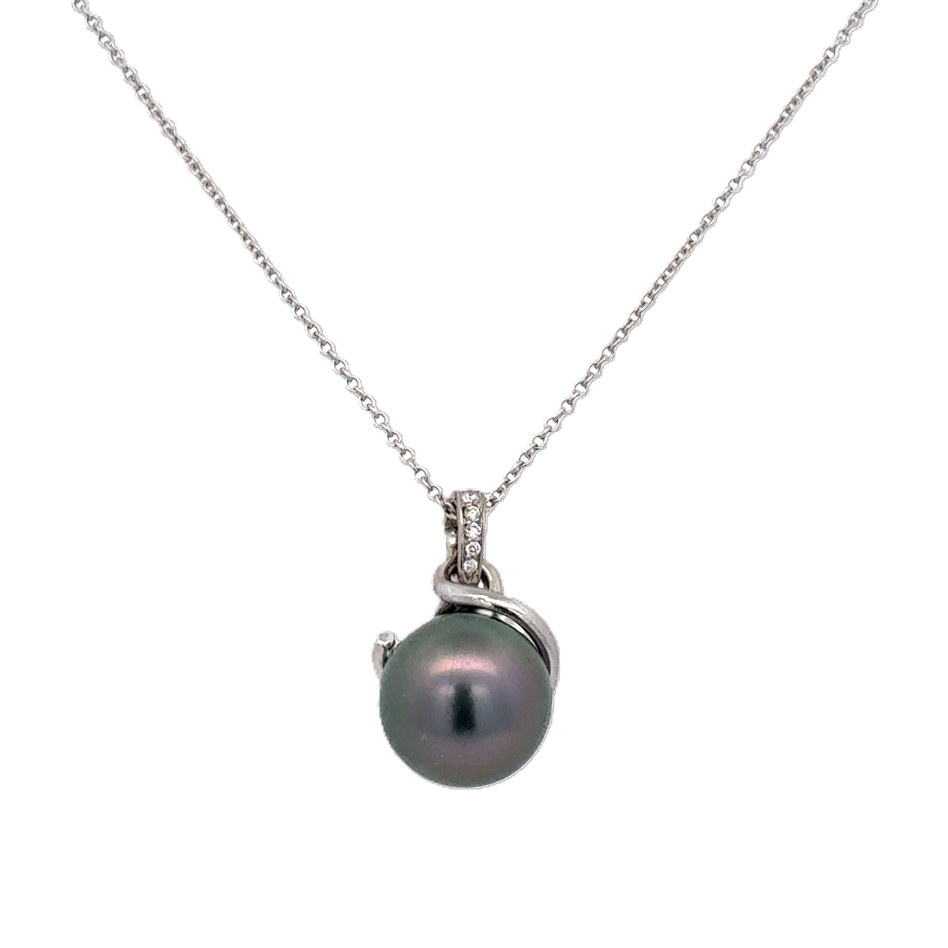 14K white gold pendant with (1) 12.4 mm Tahitian black pearl, accented by (8) round brilliant diamonds totaling .05ct. The pendant is on a cable chain measuring 16 - 18 inches with a lobster clasp.