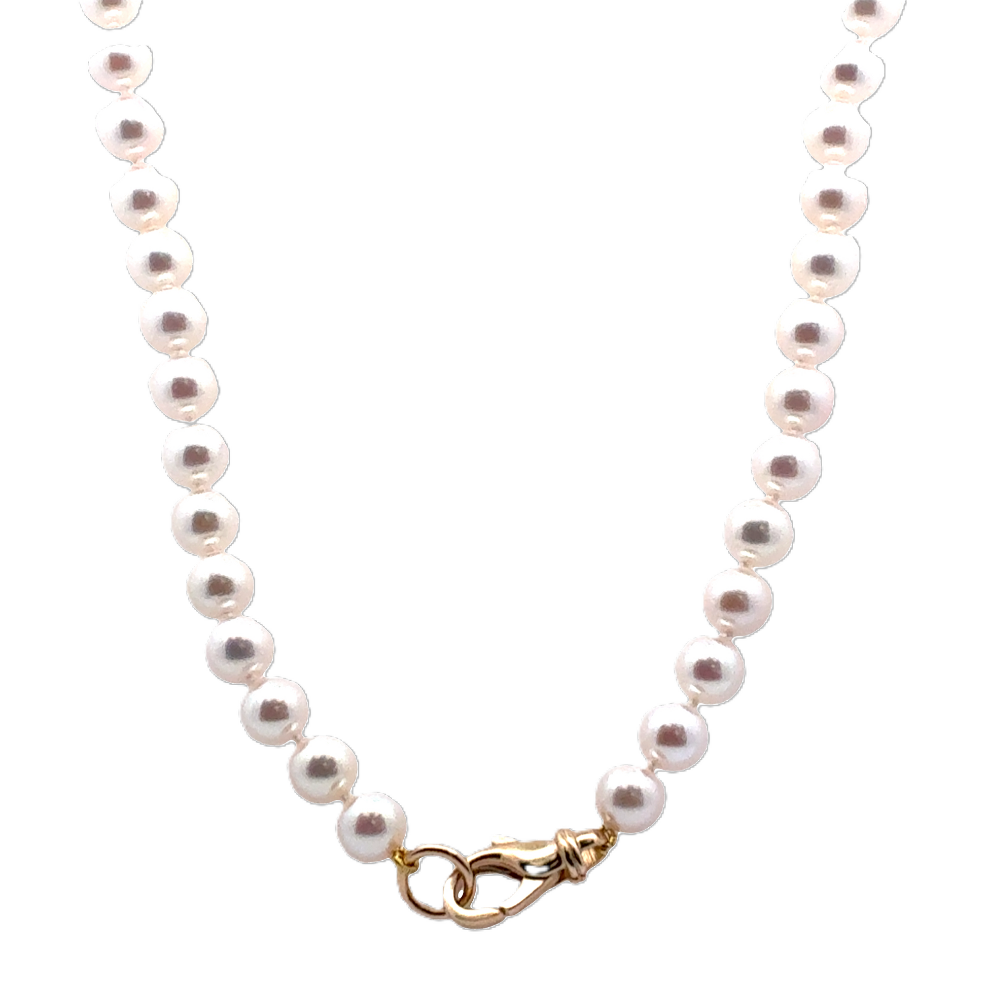 14K yellow gold strand containing (114) 7.0 x 7.5 mm Akoya pearls in 36 inches with lobster clasp.