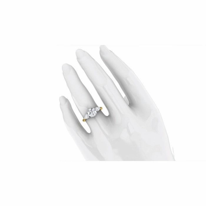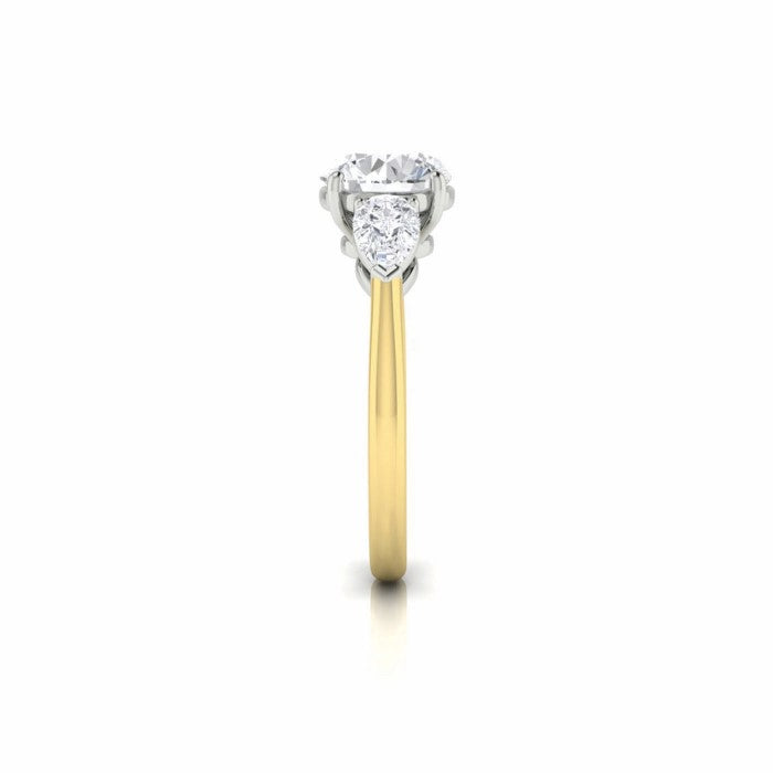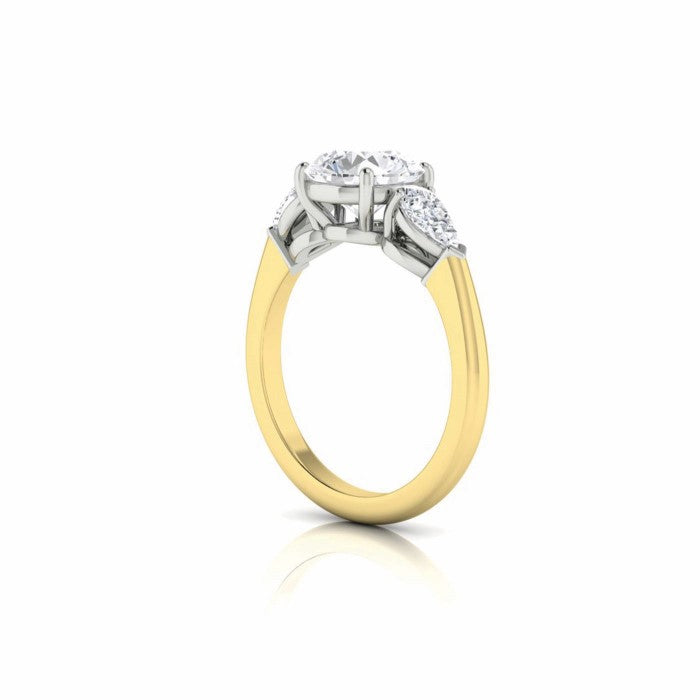 18K yellow gold with platinum engagement ring with (1) round, natural diamond weighing 1.70cts, Color; D; Clarity; VS2. The center stone is accented with (2) pear shaped diamonds totaling .51cts. Finger size 6.5.