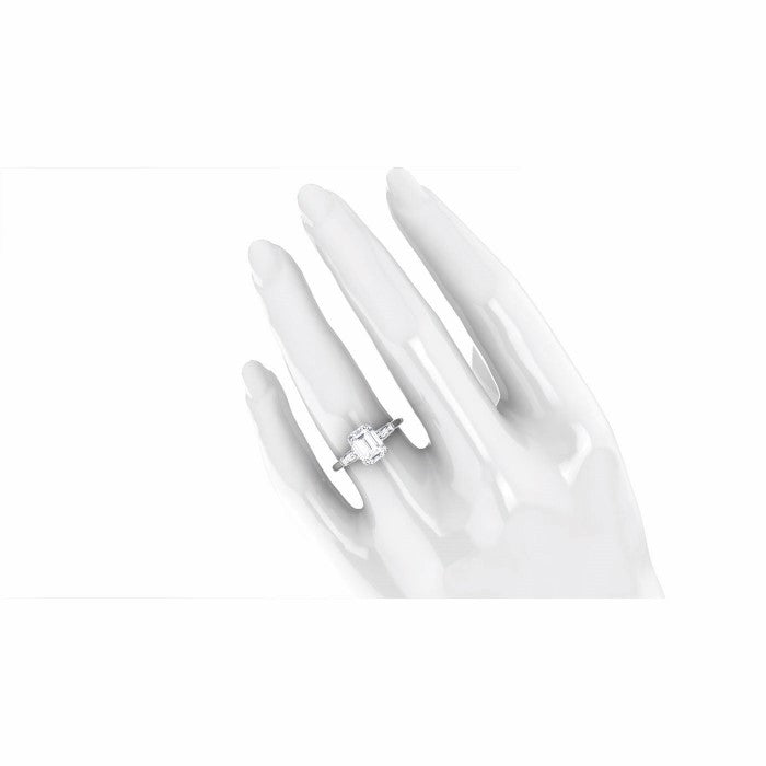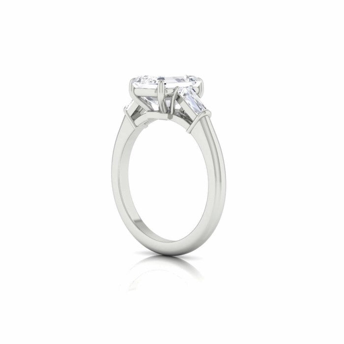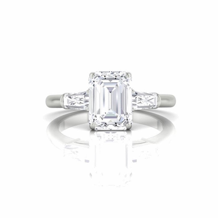 Platinum engagement ring set with (1) emerald cut, natural diamond weighing 2.0cts, Color; H; Clarity; VVS1, The center stone is accented with (2) tapered baguettes totaling .44cts. Finger size 6.5.