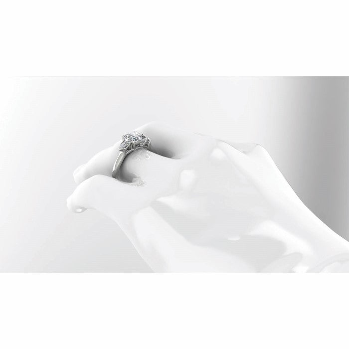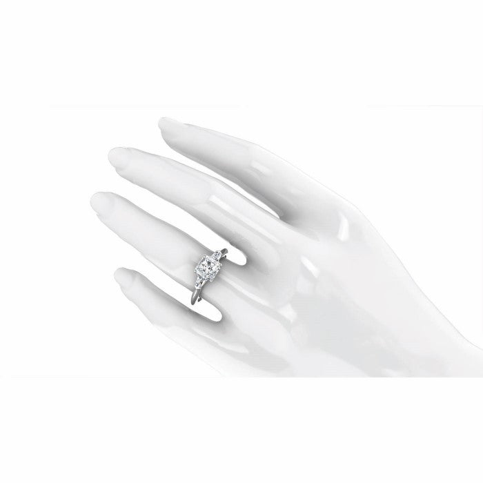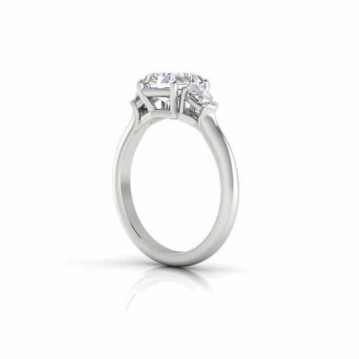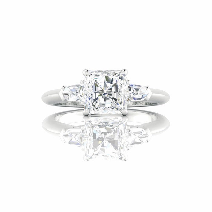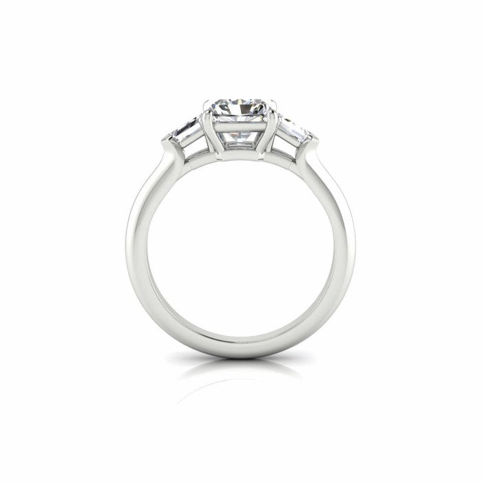 Platinum engagement ring set with (1) radiant cut, natural diamond weighing 1.26cts, Color: E; Clarity: VS1. The diamond is accented with (2) bullet cut diamonds totaling .26ct. Finger size 6.5. (This is a digital render. The color shown does not represent the actual color of the diamonds.)