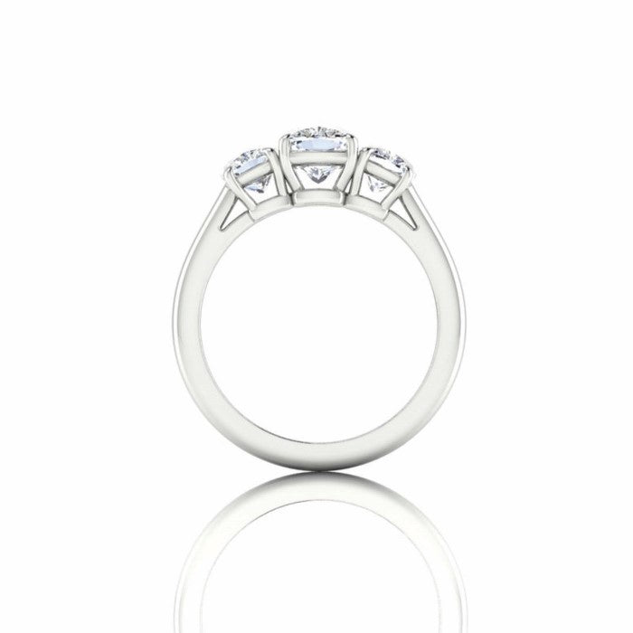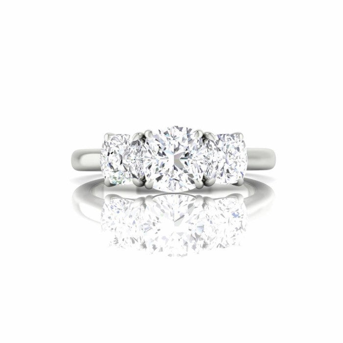 Platinum engagement ring set with (1) cushion cut, natural diamond weighing 1.0cts, Color; H; Clarity; VS2. The center diamond is accented with (2) cushion cut diamonds totaling .89cts, Color; H; Clarity; VVS1-VS1. Finger size 6.