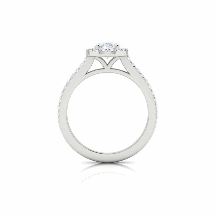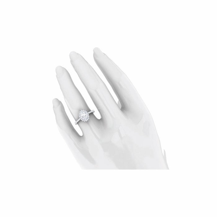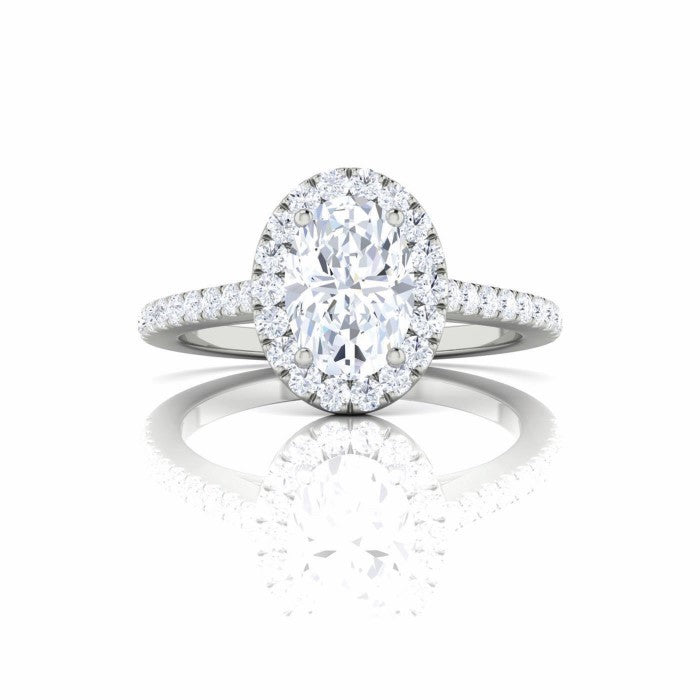 Platinum engagement ring set with (1) oval natural diamond weighing .90cts, Color; D; Clarity; SI1. the center diamond is surrounded by and on shank with (38) round diamonds totaling ,27cts. Finger size 6.5.