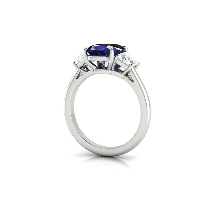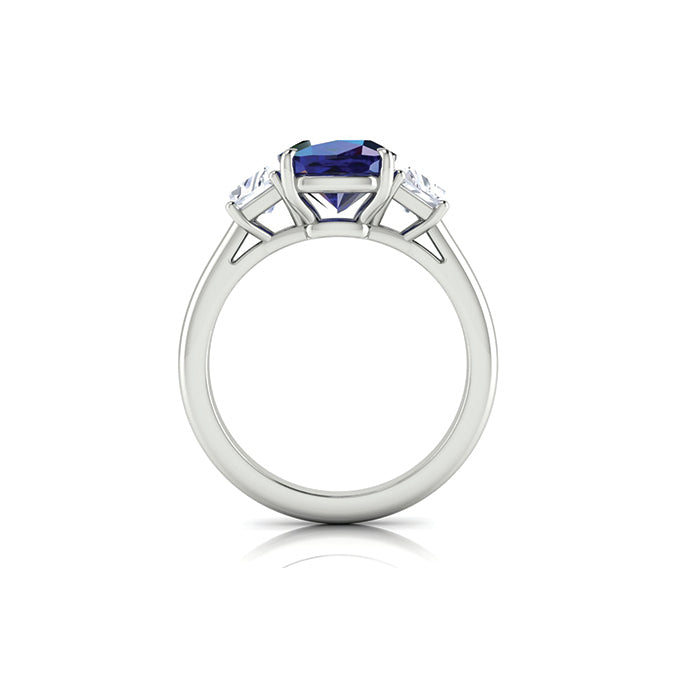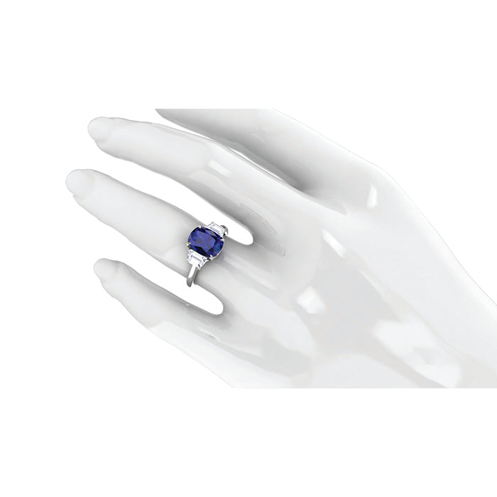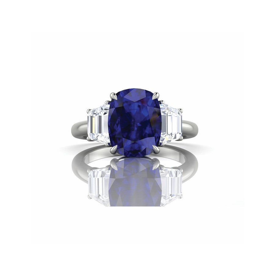 Platinum ring set with (1) cushion cut blue sapphire weighing 2.78cts. accented with (2) trapezoid diamonds totaling .72cts, Color: F; Clarity: VS. Finger size 6.5