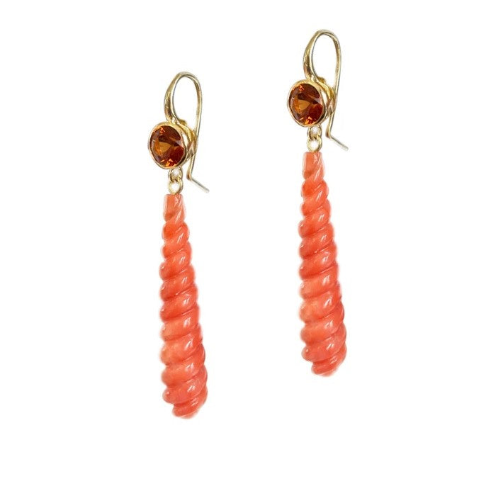 18K yellow gold 6mm Crownwork® bezel set earrings set with (2) swirl coral stones totaling 20.7cts and (2) round garnets totaling 3.2cts. The earrings are on a wire.