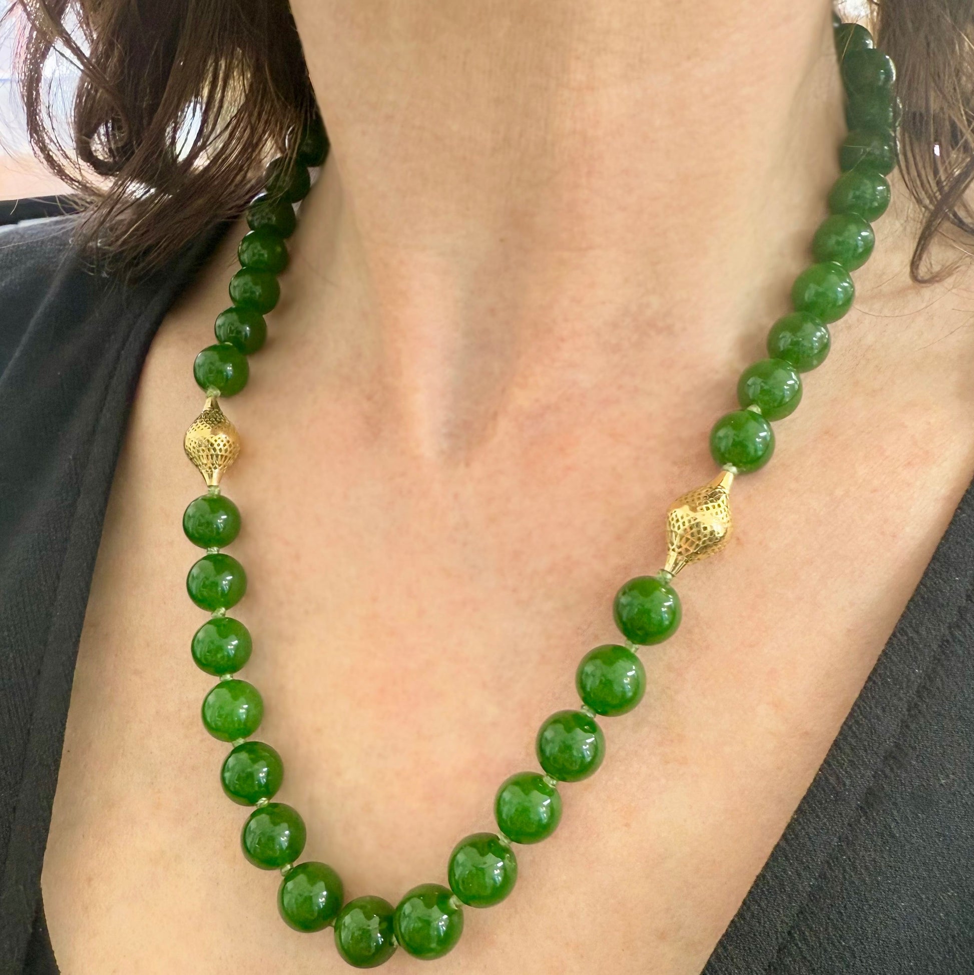 Necklace with (39) jade beads and small 18K yellow gold Crownwork® finials and lily pad clasp. The necklace is 20 inches.