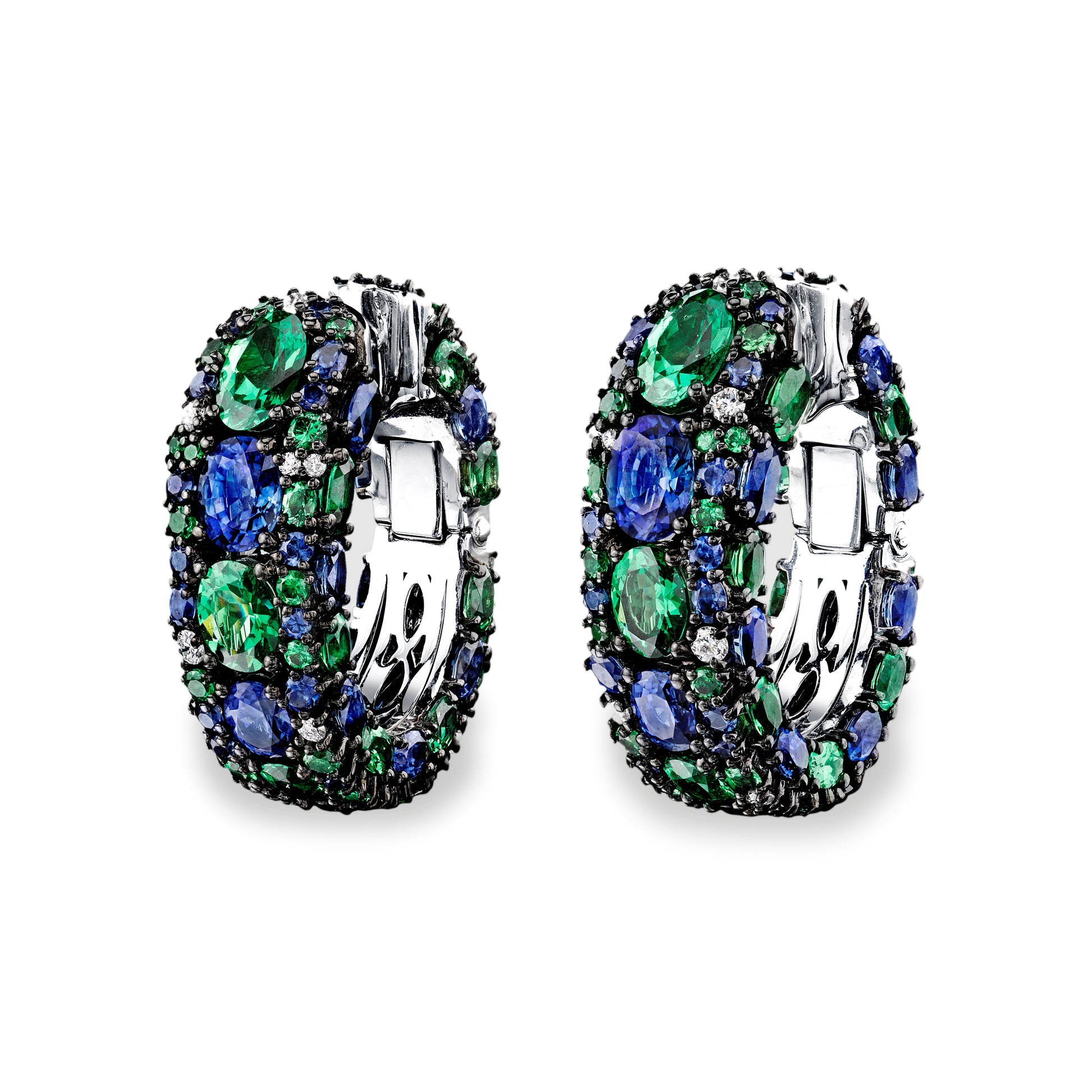 18K white gold American Glamor hoop earrings set with (98) round and oval tsavorites totaling 5.27cts, (96) oval and round blue sapphires totaling 4.63cts and (30) round brilliant cut diamonds totaling .30cts. The earrings have clutch backs.