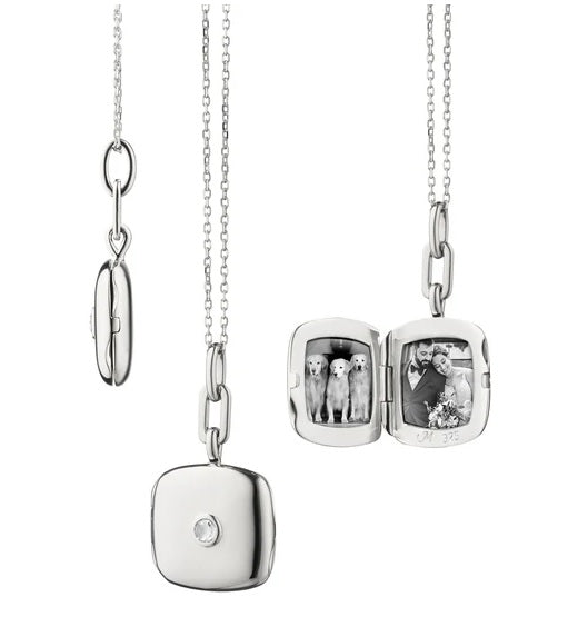 Slim cushion "Viv" sterling silver locket with (1) rose cut white sapphire weighing .06cts, mini diamond cut chain in 16 to 18 inches.